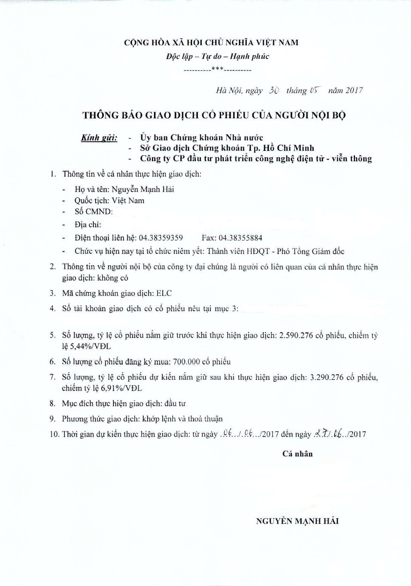 Báo cáo kết quả giao dịch cổ phiếu của người nội bộ Nguyễn Mạnh Hải
